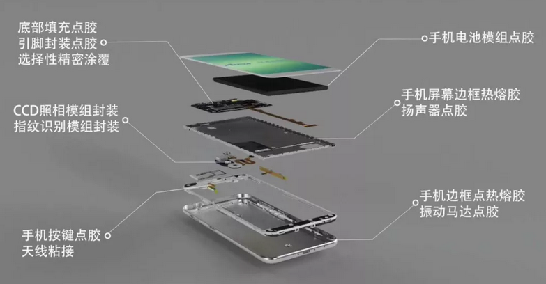 事實(shí)上,電子膠粘劑一直以來都在電子電器、汽車、軌道交通、航天航空、軍工等工業(yè)制造領(lǐng)域發(fā)揮意想不到的驚人作用和舉足輕重的價(jià)值。就智能手機(jī)而言,其主要膠水應(yīng)用主要要以下幾種: