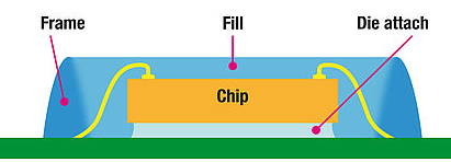 用作芯片包封膠的許多膠水是紫外光固化環(huán)氧樹脂基的,這類膠水在紫外光下可以幾秒鐘內(nèi)固化。這使其可以適應(yīng)全自動(dòng)化的批量生產(chǎn)。(UV膠水)