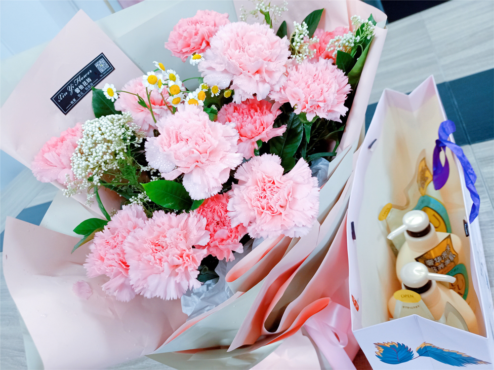 花語雖無聲,但此時無聲勝有聲。一簇簇康乃馨色澤明亮,嬌艷動人。有紅色的,有粉色的。紅色的高貴典雅,氣質(zhì)出眾;粉色的青澀甜美,讓人怦然心動,是種初戀的感覺。每一簇鮮花都是用平滑單色的巴黎紙包扎,再系上一支粉色的蝴蝶結(jié),更顯得優(yōu)雅動人。再看看禮物袋子里面裝了什么,哇,乳白色包裝的沐浴露,不同味道的四個單品,公司實在是太貼心了。
